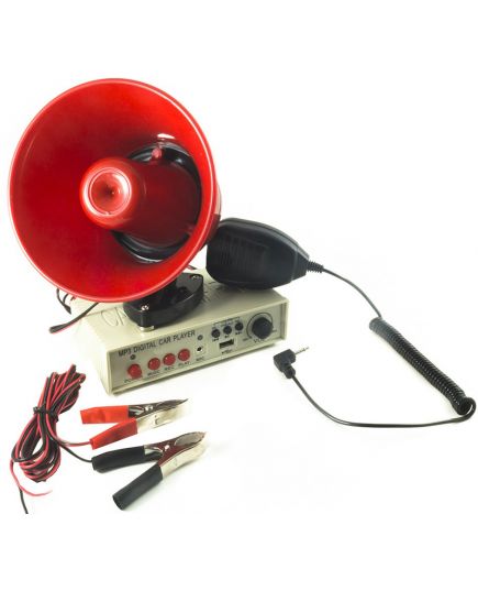 Kit composto da megafono, da fissare sul veicolo grazie alle tre calamite collocate sulla base, amplificatore/registratore a cui va collegato il microfono che può essere utilizzato per annunci o registrazioni degli annunci.
