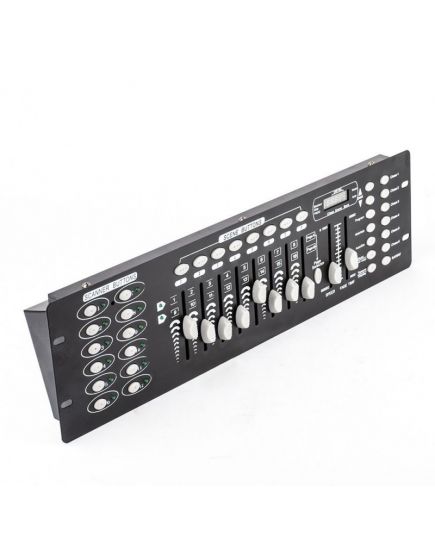 Funzioni principali: 192 canali con possibilità di controllare 12 unità con un massimo di 16 canali cad, 6 chase programmabili da 240 scene, memoria di 30 banchi da 8 scene, 8 slider per controllo manuale, modalità automatica con possibilità di controllo velocità e dissolvenza tra una scena e l’altra, pulsante Master blackout, possibilità di invertire i canali di alcune apparecchiature (es. pan e tilt delle teste mobili) per farle comportare all’opposto di altre durante l’esecuzione dei chase, microfono interno, selettore polarità DMX, display a 4 cifre.