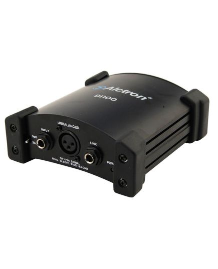DI Box attiva in un robusto alloggiamento in metallo (alluminio/acciaio) con protezioni angolari, argento-blu/metallizzato, batteria interna da 9 V (l'indicatore lampeggia durante il funzionamento) che si spegne automaticamente quando viene utilizzata l'alimentazione phantom (l'indicatore LED è sempre acceso)