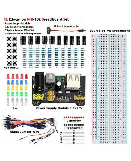 Kit componenti elettronici diodi/condensatori/pulsanti con breadboard e modulo di alimentazione 3.3V/5V MB102