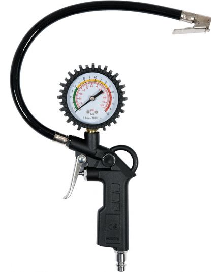 Una pistola con un manometro per il gonfiaggio. Ha un cavo da 35 cm con valvola in metallo.