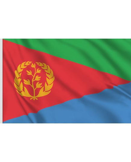 Bandiera nazionale, di stato e mercantile alzata il 24 maggio 1993, giorno dell’indipendenza. Contiene elementi tratti dalle due bandiere protagoniste della lotta di liberazione: il drappo a triangoli colorati è quello del fronte di liberazione sul quale la stella è sostituita da un emblema formato da tre rami d’olivo che ricorda quello della bandiera del 1952. La descrizione piuttosto sommaria contenuta nella costituzione provvisoria del 1993 ha dato luogo ad interpretazioni non univoche, in particolare dell’emblema; verso la fine del 1995 si è resa perciò necessaria una ridefinizione nel disegno e nelle proporzioni. Nella versione definitiva l’emblema appare più stilizzato, con i rami di olivo più somiglianti a quelli della bandiera delle Nazioni Unite; le proporzioni sono fissate in 1/2 mentre in precedenza oscillavano tra 3/5 e 2/3.