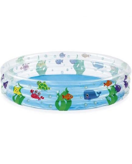Piscina con tre anelli gonfiabili trasparenti decorati con bellissimi pesciolini colorati.